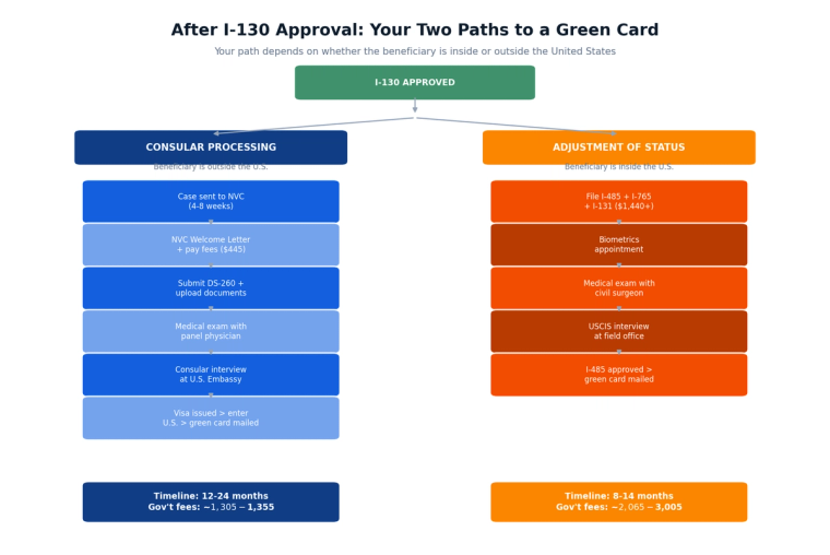 Your I-130 petition just got approved. That's good news, but your relative does not have a green card yet. The approval confirms USCIS recognizes the family relationship. What comes next depends on where your beneficiary lives and which family category you fall under. This guide covers both paths, the fees, and 2026 policy changes that could affect your case.