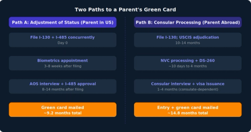 If your parent is in the United States, they may be able to adjust status to permanent resident without leaving the country. This can be faster than consular processing in some cases, but the total time varies by USCIS workload and the local field office.