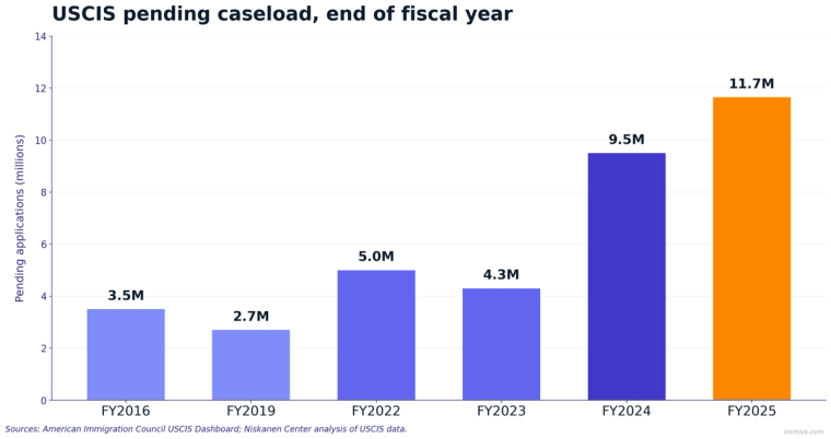 According to a new USCIS data dashboard published April 29, 2026 by the American Immigration Council, the agency's pending caseload has more than tripled over the last decade, from 3.5 million cases in the first quarter of fiscal year 2016 to 11.6 million by the end of fiscal year 2025. Separate analysis from the Niskanen Center found that completions in the fourth quarter of FY2025 dropped 22 percent year over year, while the net backlog inside USCIS's control rose by more than 800,000 cases.